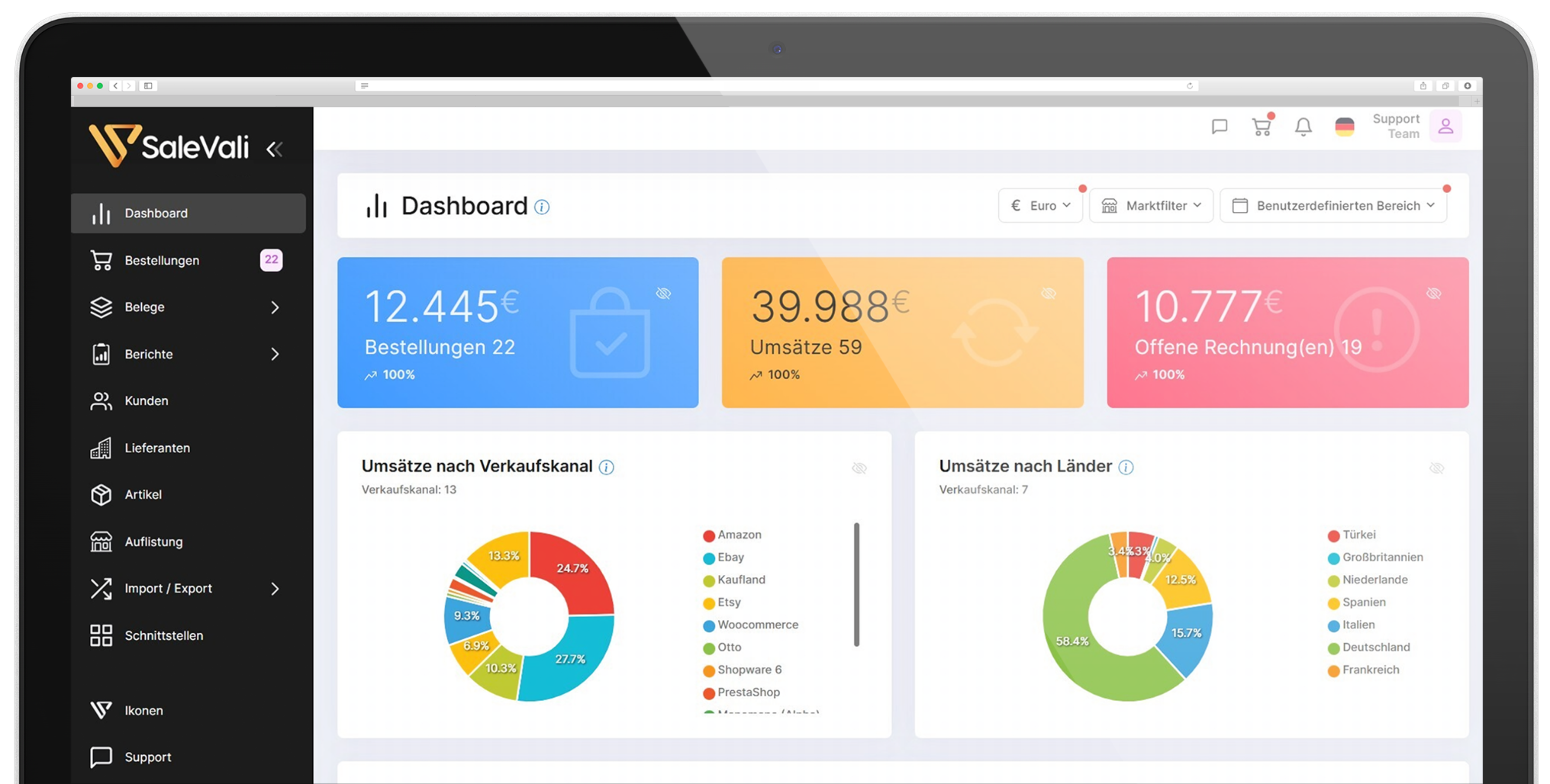 Mit SaleVali kannst du dein Geschäft effektiv skalieren und alle Prozesse automatisieren. Es ist speielend leicht einzurichten, einfach zu bedienen und bietet alle Funktionen die ein Multichannel-Händler benötigt.